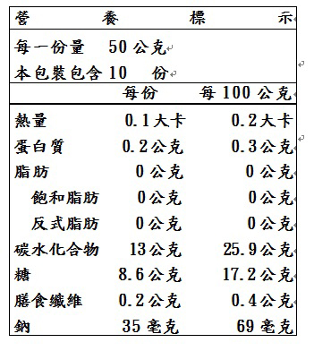 成份:水、梅子汁、麥芽糖、砂糖、梅子、果凍膠(鹿角菜膠、刺槐豆膠、蒟蒻粉、芽菜粉、玉米糖膠、氯化鉀、檸檬酸鈉、葡萄糖)、檸檬酸(甜味劑)、香料、焦糖色素
